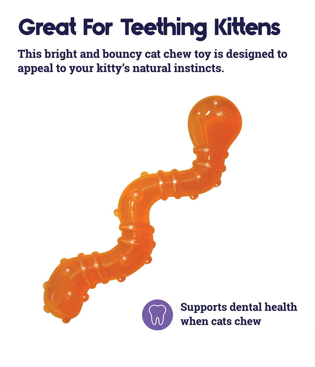 - great for teething kittens:The OrkaKat Wiggle Worm is a bright and bouncy cat chew toy that’s designed to appeal to your kitty’s natural instinct to bite and chew. Perfect for teething kittens but also suitable for cats of all ages.