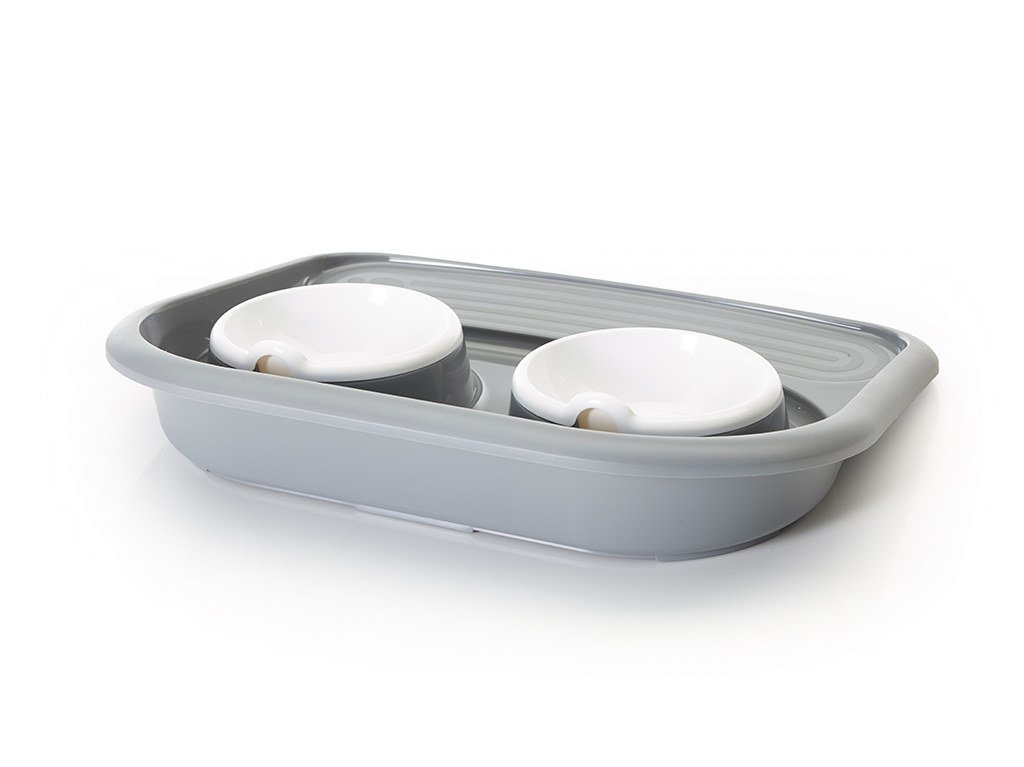 Food serving tray suitable for cats and small dogs. Butler is a great way to serve food or water to your pet without any mess. Your floor remains clean and tidy. The tray of Butler is equipped with 4 non-slip feet for extra stability. Moreover, thanks to the high rim, there is no spilling of food as it remains on the tray. You can use Butler for dry or wet food or even water. The tray contains 2 easily removable bowls of 300 ml. Butler is easy to clean and even dishwasher safe.